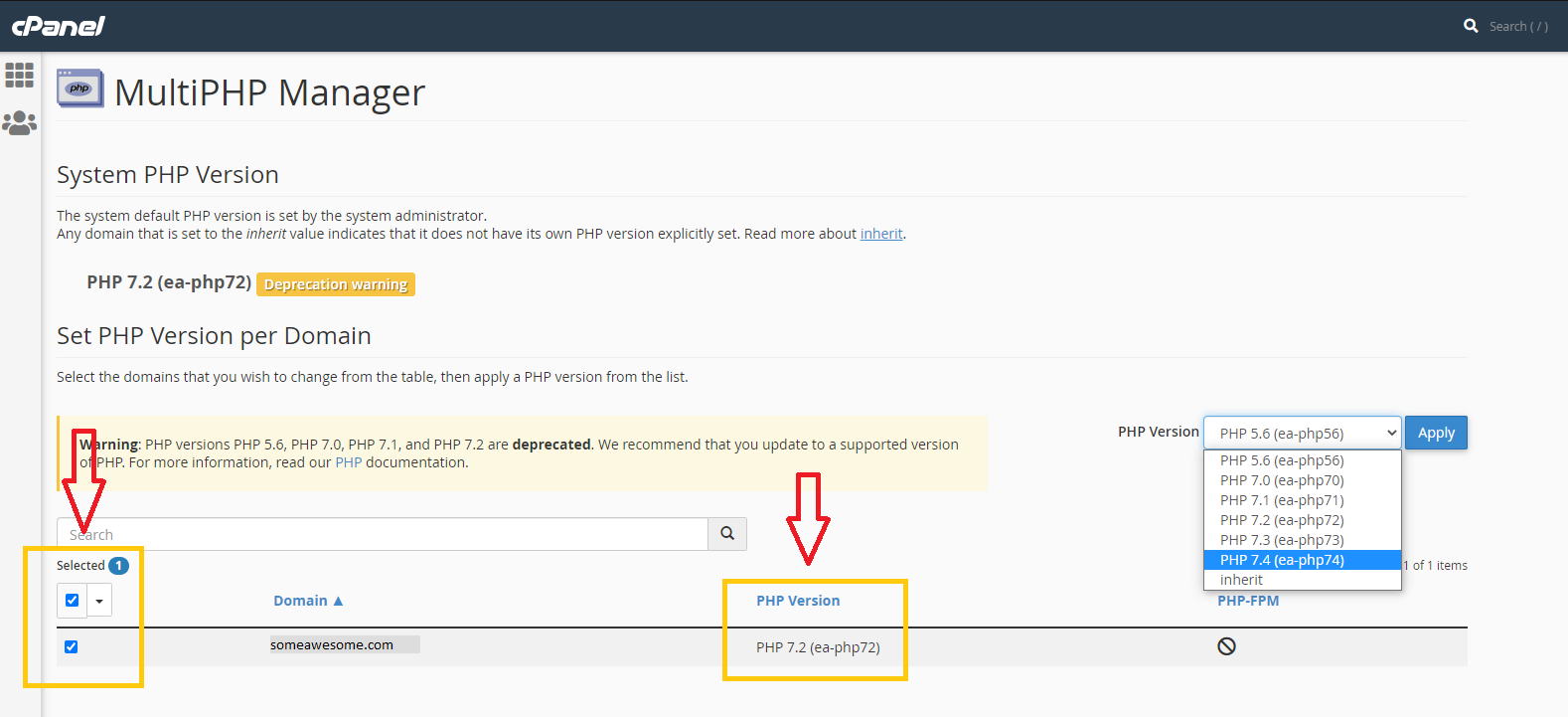 Step 3.  Select the domain you want to update by checking the box on its left side.  You can find the current PHP version for this domain on its right.