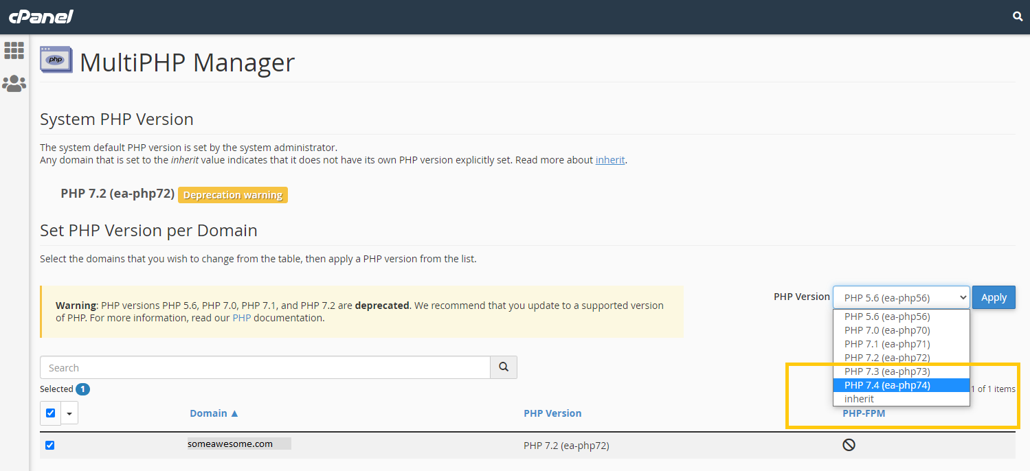 Step 4.  Choose your preferred PHP version from the dropdown, then click "Apply".